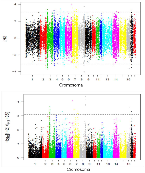Posterior al proceso de edición se estimó el iHS para 33499 SNP. En la Figura 1 se presentan los marcadores o regiones genómicas que presentan señal de selección significativa (P<0.0001), así como los iHS y piHS distribuidos a través de los diversos cromosomas. El resultado mostró disminución de homocigosidad haplotipica sobre un loci, con base en la comparación entre el alelo derivado y el ancestral dentro de una población determinada; valores extremos de iHS (negativos o positivos) denotan una homocigosidad haplotipica excesiva sobre los alelos ancestrales o derivados, de tal manera que las regiones genómicas que presentan picos de iHS en una o ambas direcciones son importantes debido a que han sufrido selección.