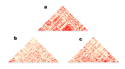 El eje de abscisas representa los loci donde se está midiendo el desequilibrio de ligamiento; el eje vertical representa los loci de contraste con el que se midió el desequilibrio de ligamiento. El valor dentro de cada celda (mapa de calor; intensidad de color) representa el valor del desequilibrio de ligamiento (r²= 0 a 1) entre los loci correspondientes; a mayor intensidad en el color, muestra desequilibrio (los alelos en esos loci se heredarán juntos); baja intensidad, indican que los loci son independientes.