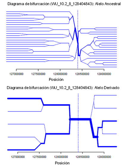 En la Figura 3 se muestra la estructura de haplotipos alrededor del alelo central (WU_10.2_8_128404843) con mayor piHS (P<0.00005). El diagrama bidireccional permite interpretar el origen de una SS, traza el desglose de DL a distancias cada vez mayores del alelo central en el SNP focal seleccionado. La raíz (SNP focal) del diagrama es el alelo central y se identifica mediante una línea punteada de forma vertical. El diagrama es bidireccional y representa la DL centrómero proximal y el centrómero distal. En una dirección, cada marcador es una oportunidad para un nodo, el diagrama se divide o no (en función de si ambos o solo un alelo) está presente; el desglose de DL en el fondo del haplotipo central se representa a distancias progresivamente más largas. El grosor de las líneas corresponde al número de individuos con el haplotipo de larga distancia indicado, a mayor número de individuos, el grosor será mayor21.