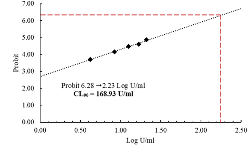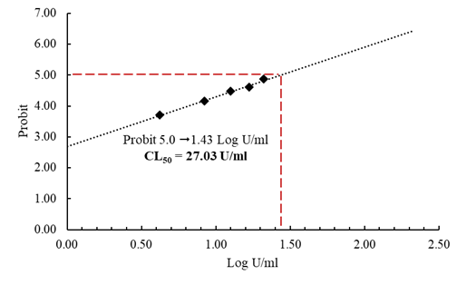 Los datos de mortalidad de larvas se emplearon para realizar el análisis Probit y calcular las unidades de actividad quitinolítica requeridas para promover la mortalidad del 50 (CL50) (Figura 1) y 90 % (CL90) (Figura 2) de la población, que fueron de 27.03 y 168.93 U/ml, respectivamente. El efecto coleoptericida mostrado por el extracto crudo de la quitinasa de B. licheniformis UV01 confirma su potencial uso como método alterno de control de A. tumida.