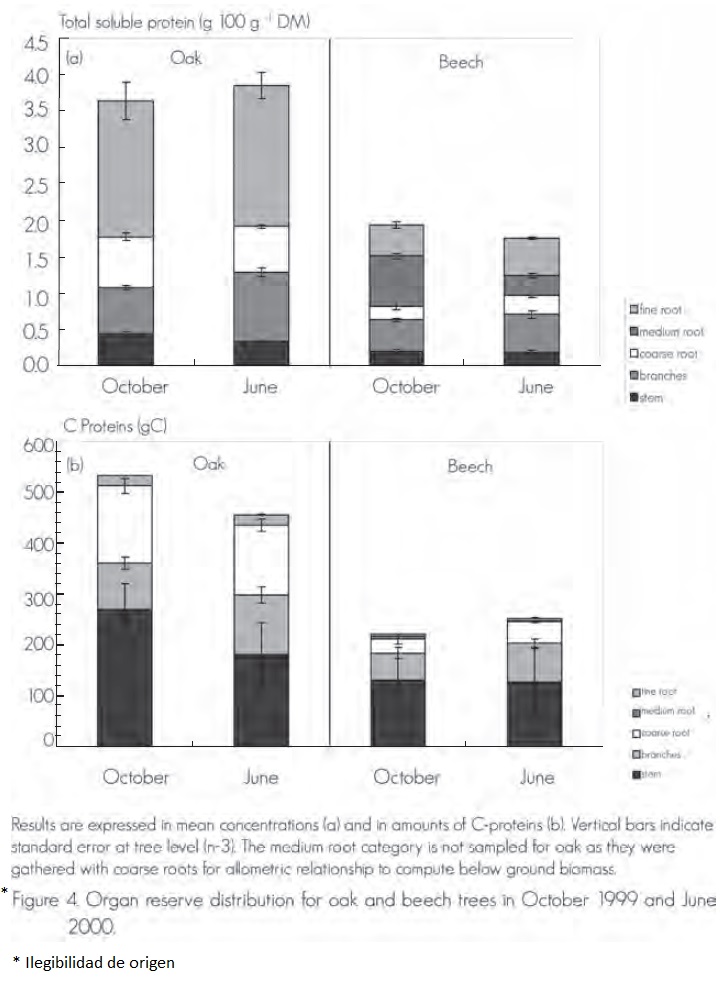 As proposed before, dates of minimum and maximum total soluble proteins concentrations seem to be not similar to those for total non carbohydrate reserves (minimum in June and maximum in October) and this would explain the low values obtained. Sauter and Van Cleve (1990; 1994) already mentioned a seasonal pattern of proteins clearly different from starch in poplar. They reported a first, rapid and prominent decrease in Spring, still parallels the mobilization of starch during outgrowth of buds. Finally, the involvement for other C-reserve materials has to be investigated, especially for beech. Neither amino-acids nor amides have been included in the present calculation which may also contribute in a small extent to potential carbon source. For nitrogen needs in spring, amino-acids and amides are potential sources in competition with new nitrate uptake. Such a partitioning would be better quantified by using a labeling experiment.
