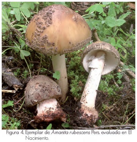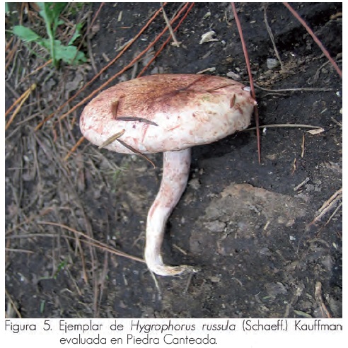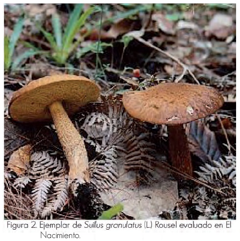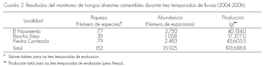 Al concluir las tres temporadas de monitoreo de la producción natural de hongos comestibles se identificaron 153 especies, pertenecientes a 31 familias y 44 géneros; de ellas, 69% son ectomicorrizógenas y 31% saprótrofos, con una abundancia total de 15,925 esporomas, que registraron un peso fresco total de 193,688.8 g (Cuadro 2). Los taxa con valores altos de producción fueron: Hygrophorus russula (Schaeff.) Kauffman (5,681 g) y Boletus erythropus Pers (3,856 g), en Piedra Canteada; Cantharellus cibarius Fr. (2,008 g) y Russula brevipes Peck (4,291 g), en Rancho Viejo y Amanita rubescens Pers. (2,935 g) y Suillus granulatus (L.) Roussel (1,710 g), en el Nacimiento (figuras 2 a 5).(3, 4)