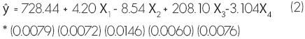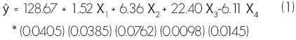 La R2 fue de 0.90, lo cual indica que alrededor del 90% de la variabilidad del peso fresco de los hongos es explicada por el modelo de regresión (Montgomery et al, 2004). El valor de p de la prueba de F fue de 0.0268, por lo que las variables consideradas contribuyen en forma significativa en la predicción de la producción de hongos. Para las cuatro variables independientes el valor de p correspondiente a la prueba de t fue menor al 0.05. El agregar una unidad a todas las variables independientes, excepto en el número total de árboles y del diámetro de copa promedio de la parcela, incide en la disminución del valor de la producción total de hongos en la misma.