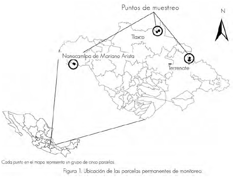 El estudio se llevó a cabo en tres predios forestales: El Nacimiento, municipio de Tlaxco; Rancho Viejo, municipio de Terrenate y Piedra Canteada, municipio de Nanacamilpa de Mariano Arista (Figura 1). Dichas localidades fueron seleccionadas a partir de su riqueza fúngica y forestal (Zamora et al., 2000), el tipo de propiedad territorial, su forma de manejo, su biodiversidad y las condiciones ecológicas contrastantes entre ellas.