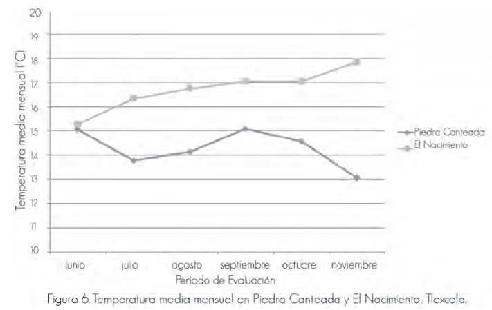 Para el caso de las dos localidades de Tlaxcala, cuyos resultados se consignan aquí, sobresale el poder predictivo de la temperatura media mensual sobre la producción de fructificaciones (Piedra Canteada), mientras que en El Nacimiento este es de tipo negativo. Los resultados se explican a partir de los registros de la temperatura media mensual, mismos que son superiores en El Nacimiento (Figura 6), lo cual responde a la menor densidad arbórea (Cuadro 3). Así, al disminuir la temperatura, la evapotranspiración también se reduce y en consecuencia la disponibilidad de agua en el suelo se conserva mayor tiempo, lo que a su vez favorece la emergencia de los esporomas (Villanueva-Jiménez et al., 2006).