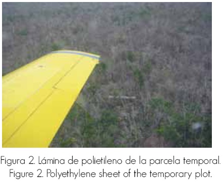 Las parcelas temporales fueron cubiertas con una lámina de polietileno calibre 150 de 3 m de ancho por 16.6 m de largo (Figura 2) con el propósito de evaluar la cantidad de semillas dispersadas por la aeronave. Para facilitar la colocación de la cubierta plástica en los 50 m2 que correspondían a la parcela temporal fue necesario limpiar el espacio de vegetación con motosierra y machete.