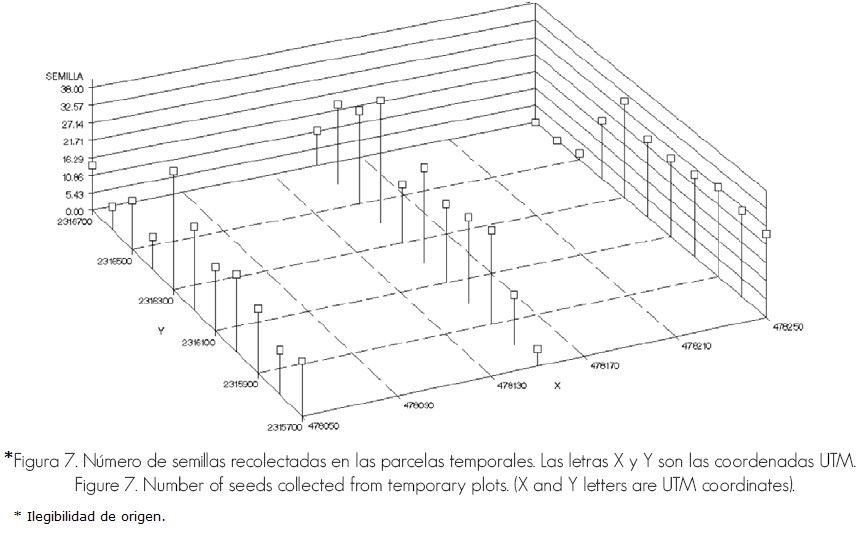 La información de campo se analizó mediante el Statistical Analysis System (SAS) V8, y consistió en estimaciones puntuales y por intervalo (al 95% confianza) de cada uno de los siguientes parámetros: número promedio de semillas dispersadas por hectárea, número promedio de plántulas por hectárea y altura promedio de las plántulas a los 45 y 90 días de la siembra aérea.