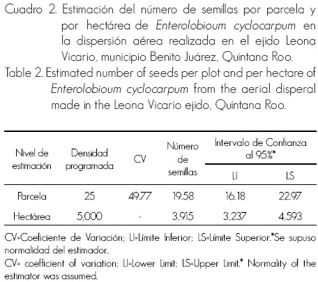 El número de semillas por hectárea dispersada por la aeronave se estimó entre 3,237 y 4,593 (95% de confianza), por lo que la densidad programada (5,000 semillas ha-1) no se logró.