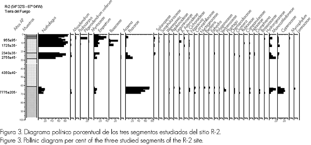 A partir del análisis de los segmentos del perfil R-2 se identificaron 36 tipos polínicos (Figura 3). El inferior reúne altos porcentajes de la familia Poaceae (30-72%) y de plantas características de los suelos húmedos (Cyperaceae y otras Monocotiledoneae). Aparecen también especies herbáceas y arbustivas, incluido Empetrum sp (0 y 8.5%), en escasa proporción pero en forma constante. Como taxón arbóreo se identificó el género Nothofagus con valores bajos (2-18%), acompañado por Misodendrum , parásito del primero. La composición polínica de este segmento del perfil corresponde con la composición polínica de muestras procedentes de la estepa (Trivi et al., 2006) que existe en la actualidad, hacia el norte de la Isla, donde se registran precipitaciones menores a 400 mm anuales.