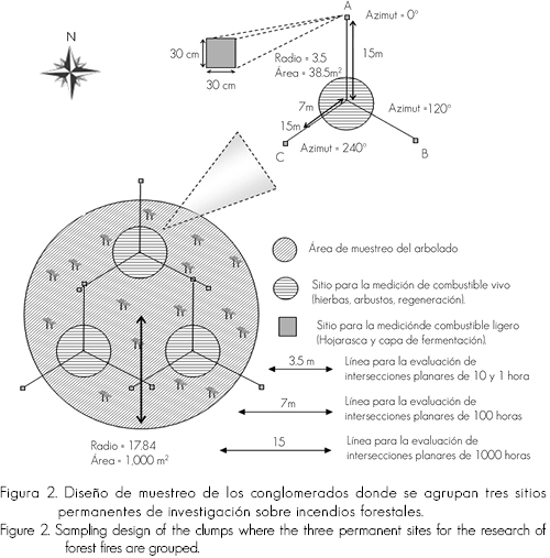 Una vez elegidas las áreas de muestreo se registró su ubicación geográfica específica; para ello se georrefirió el centro del conglomerado con ayuda de un geoposicionador (GPS). Posteriormente, se delimitaron tres sitios de 38.5 m2 cada uno, ubicados dentro del conglomerado (Figura 2). En cada sitio se trazaron tres transectos, cuya referencia fue el centro del sitio. El primero se instaló 7 m hacia el norte franco, en el cual se colocaron tres cuerdas de 15 m cada una. La primera línea se orientó al norte franco, la segunda a 120° y la tercera a 240° (Figura 2) para un total de 45 m de muestreo por sitio. Al final de los transectos se colocó un cuadro de 30 x 30 cm, en el que se evaluaron los combustibles ligeros (capa de hojarasca y fermentación). Antes de trazar los conglomerados se estimó la pendiente y se le compensó dependiendo del porcentaje de desnivel y longitud.
