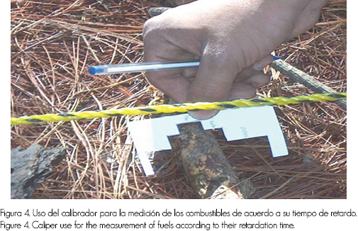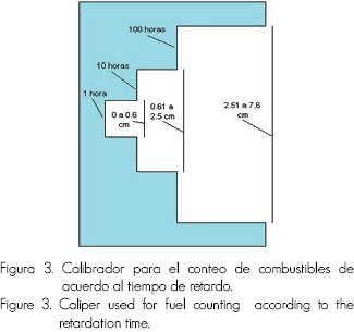 Para facilitar la toma de datos se utilizó un calibrador de elaboración propia (Figura 3), el cual permite que la contabilización sea efectiva y rápida, ya que tiene las medidas de cada clase de combustible: 0 - 0.5 cm de diámetro (de 1 hora) y combustibles entre 0.6 y 2.5 cm de diámetro (10 horas), presentes en la línea de 3.5 m. En la línea de 7 m se contaron aquellos con un diámetro superior a 2.51cm y menor a 7.5 cm (100 horas).