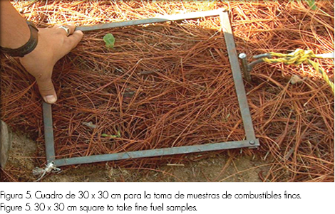 Finalmente, en el transecto de 0 a 15 m se obtuvieron los diámetros de los combustibles que se intersectaron (Figura 4), con un diámetro superior a 7.5 cm (1,000 horas), y se clasificaron en podridos o firmes (Rodríguez, 2002; Flores y Omi, 2003). En todos los sitios se usó la misma técnica. En el cuadro de 30 x 30 cm se cuantificaron los combustibles ligeros, hojarasca y capa de fermentación (Figura 5).