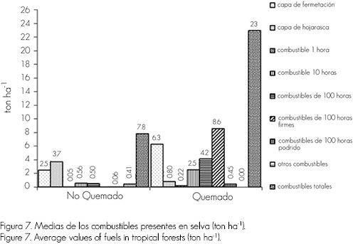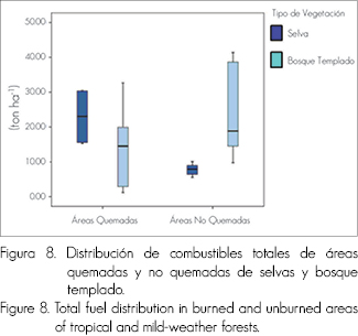 Para los sitios correspondientes a selvas sin fuego, la media se estimó en 7.81 ton ha-1, con una desviación de 1.68, lo cual implica que la dispersión de los datos es menor, en comparación con la que se obtuvo para los de bosque templado. En los conglomerados de las áreas quemadas se calculó una media de 22.97 ton ha-1 y una desviación de 8.55, lo que evidencia una dispersión de los datos más grande, al confrontarla con las zonas no quemadas. En los bosques templados es menos dispersa. La Figura 7 muestra las medias de los combustibles presentes en las áreas con y sin incidencia de los incendios forestales.
