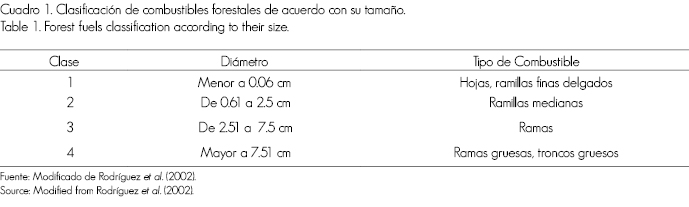 Existen varios criterios para clasificarlos, por ejemplo de acuerdo a su peso, en ligeros y pesados (Brown et al , 1982). Los ligeros están compuestos por ramillas muertas, hojarasca, hierbas (secas o verdes) y humus; también se les denomina combustibles finos, ya que se acumulan por la caída natural de los diferentes estratos vegetales; los pesados se agrupan en función de su tiempo de retardo (Cuadro 1). Es decir, el tiempo que tarda en perder o ganar dos tercios de la diferencia entre su contenido de humedad y la humedad del ambiente (Rodríguez y Sierra et al., 1995; Muñoz, 2001), e incluyen a ramas, tallos y troncos muertos o derivados de los derribos por factores naturales ó residuos provenientes de cortas de árboles (Flores y Benavides, 1994).