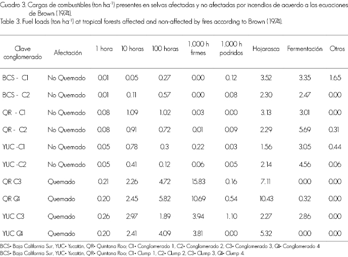 Las áreas de selva no quemadas registraron una disponibilidad de 2.5 a 6 ton ha-1 en la capa de fermentación y en la de hojarasca de 1.5 a casi 4 ton ha-1, (Cuadro 3). Para los sitios ubicados en Quintana Roo se determinó una disponibilidad de combustibles de 10 h; esto se relacionó con la localización de los conglomerados, la cual estuvo cerca de la zona afectada por el ojo del huracán Dean, que alcanzó vientos de 300 km hr-1 y provocó la caída de biomasa. No obstante, los combustibles de 1, 100 y 1,000 horas presentaron una baja disponibilidad, menor a una tonelada, en cambio los combustibles como bellotas, corteza, etc., la incrementaron arriba de 1.5 ton ha-1. Para el caso de las áreas con incendios forestales hubo una carga superior de combustibles finos, con valores de entre 10.4 y 7 ton ha-1, de hojarasca. Los sitios muestreados en Quintana Roo sobresalieron por la disponibilidad de combustibles; así, para los de 1,000 h firmes se contabilizaron 16 ton ha-1, seguidos por los de 100 y 10 horas con 6 y 3 ton, respectivamente. En Yucatán, el registro de combustibles de 1,000 h en estado de degradación (podridos) superó 1 ton ha-1. La categoría con menor disponibilidad fue la de 1 hora.