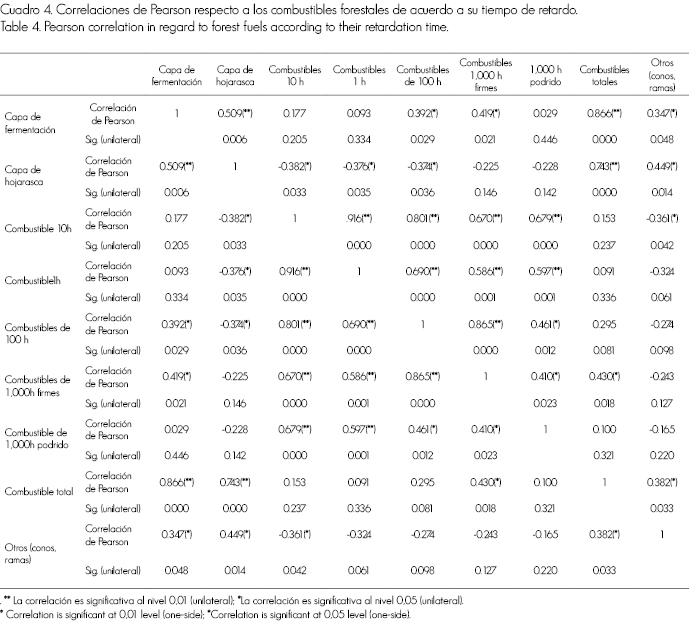 Se determinó que existe una correlación baja en la disponibilidad de biomasa de acuerdo al tiempo de retardo, mediante la prueba de Pearson. En el Cuadro 4 se muestra una significancia unilateral hasta 0,01 y 0,05, que indica un nivel de correlación muy bajo, casi nulo. Para el caso de los combustibles de 1 hora es de casi 1 (0,05), e implica que es significativa y unilateral con los de 10 horas. Los combustibles totales y la capa de fermentación alcanzan una correlación de casi 1. A partir de estos resultados, se pone de manifiesto que el incremento de cualquiera de las categorías no depende directamente de los otros grupos de combustibles, por lo que no existe correlación alguna.