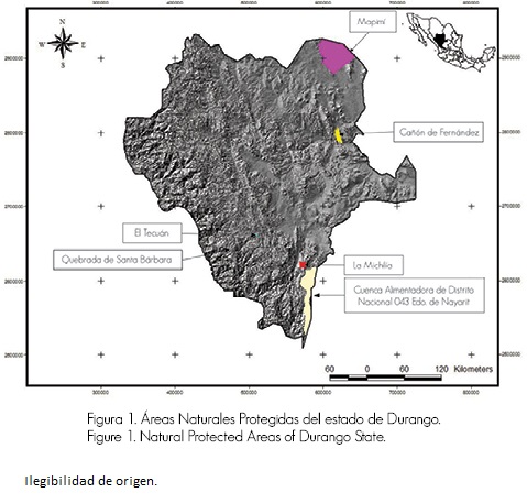 En Durango existen, actualmente, seis ANP oficiales que abarcan 353,229 ha y corresponden a 2.9 % del territorio (Figura 1); tres son de jurisdicción federal y tres estatal. Del total de ANP dos cuentan con un programa de manejo (CONANP, 2006; Biodesert, et al ., 2003), bajo la supervisión de un experto forestal; sin embargo, como los planes de manejo tienen una vigencia de cinco años, sólo el de Mapimí está vigente.