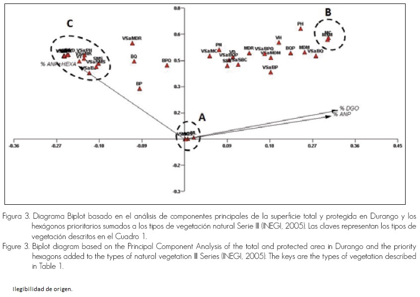 Los resultados del ACP (Figura 2) muestran la correlación (p<0.05) existente entre los tres grupos de variables (porcentaje de la superficie total protegida en el estado y hexágonos prioritarios). La longitud de las líneas de las variables constituyen la dirección de la máxima variación, y ésta es proporcional a la tasa de cambio; por consiguiente, los puntos (tipos de vegetación) en los bordes del diagrama (más alejados del origen) son los que presentan mayor variación e indican el grado de correlación entre las variables, mientras que los puntos más cercanos al centro son los de menor variación.