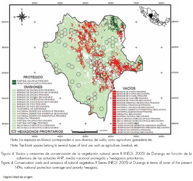 La cubierta digital de uso del suelo y vegetación Serie III (INEGI, 2005) para Durango presenta 41 categorías, de los cuales 38 son tipos de vegetación natural con una extensión de 9'629,553 ha, es decir 78 % del territorio estatal, el resto corresponde a usos antrópicos o vegetación inducida. En las ANP, se identifican en las áreas de vegetación natural 19 tipos como vacíos de conservación, 17 omisiones de conservación y dos tipos de halófila: la primaria y el pastizal halófilo primario, con una superficie de 208,341 ha, 2.2 % del área estatal, ambos están protegidos en proporciones superiores a 12 % (media nacional protegida) (Cuadro 1).