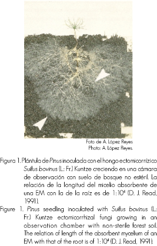La biomasa microbiana en la rizosfera de las plantas es hasta 10 veces superior a la del suelo y son los microorganismos los que transforman a la materia orgánica en humus, que es el C más estable. Además, la biomasa de la raíz es mucho mayor en presencia de microorganismos simbiontes (hongos ectomicorrízicos, micorrízico-arbusculares, fijadores de nitrógeno) los que, además de proveerles nutrientes y agua, tienen impactos no nutricionales sobre las plantas, como capacidad para excluir iones tóxicos, influencia sobre la fotosíntesis y actividad hidráulica de la planta y control de patógenos (como base al aumento de idoneidad). La micorriza no solo tiene importancia en la alimentación de la planta, sino va más allá de la absorción haciendo mayores contribuciones en su aptitud de adaptación a diferentes condiciones edáficas y como requisito para completar el ciclo de vida de las plantas (Read, 1997), sino también en la formación y mantenimiento de la estructura del suelo, crucial para la infiltración de agua, procesos de reciclaje de nutrientes y resistencia contra la erosión del suelo (Read, 1998). Las figuras 1 y 2 muestra las ectomicorrizas (EM) de una plántula de pino y una planta de encino respectivamente, donde se ilustra la razón de los enunciados anteriores.