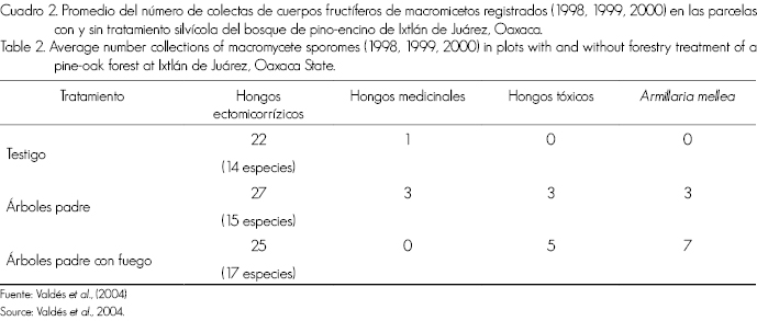 Otro factor importante cuando hay disturbio que afecta la salud de los árboles es la invasión por fitopatógenos. En áreas donde los árboles han sido cortados como parte del manejo del bosque, las plántulas de pino son afectados por el hongo fitopatógeno Armillaria mellea (Vahl.:Fr.) Karsten, conduciéndolas con frecuencia a su muerte. Este hongo frecuentemente mata árboles estresados por sequía, por insectos, por patógenos o por condiciones ambientales desfavorables; también, bajo ciertas circunstancias, puede incluso conducir a árboles vigorosos a la muerte (USDA Forest Service, 1979). El daño causado por esta especie ocasiona una enfermedad severa sobre todo en plantaciones (Morrison, 1981). Una gran población del hongo parásito A. mellea fue detectada en rodales de pino con tratamiento silvícola con y sin fuego; ninguno en la parcela testigo. El número de ejemplares de este hongo fue de más del doble en la parcela tratada con fuego que en la parcela tratada sin él (Valdés et al., 2004) (Cuadro 2, Figura 5).