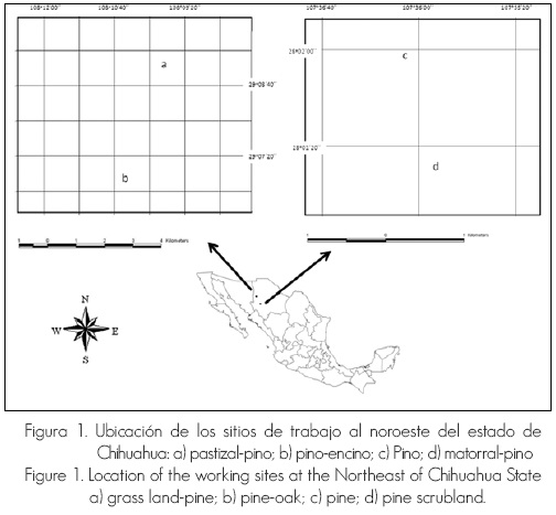 El presente trabajo se desarrolló con información obtenida de cuatro ecosistemas forestales (Cuadro 1) ubicados en la parte noroeste del estado de Chihuahua (Figura 1). Las áreas seleccionadas fueron georreferidas con un sistema de geoposicionamiento global.