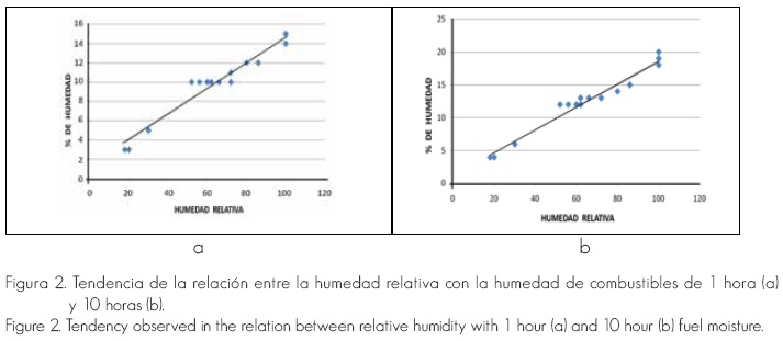 En la práctica es recomendable usar el modelo lineal (Figura 2), con la humedad relativa como variable independiente. Por otra parte, la correlación de la temperatura con el contenido de humedad de combustibles de 10 horas fue baja, con una R2 máxima de 0.578 (modelo polinómico).