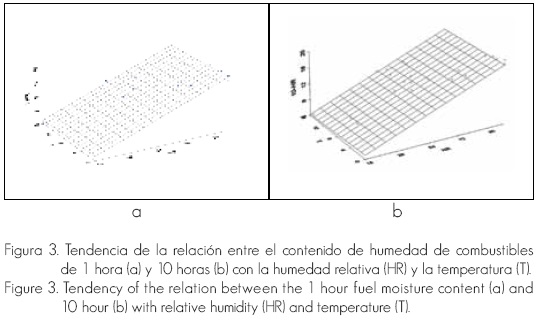 En la Figura 3 se indica la tendencia de la relación del contenido de humedad de los combustibles de 1 hora, con respecto a la combinación de las variables independientes de temperatura y humedad relativa. Es clara la mayor influencia de esta última.