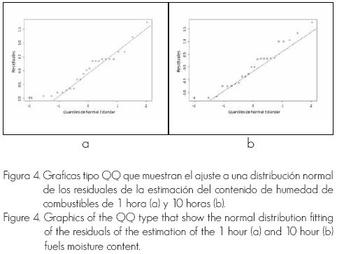 El análisis de la normalidad en la distribución de los residuales se presenta en la Figura 4, en ella se aprecia que se agrupan (ajustan) a lo largo de la recta Residuales = Quantiles de Normal Estándar , por lo que puede concluirse que los residuales, tanto para combustibles de 1-hora como de 10-horas, tienen una distribución aproximadamente normal.