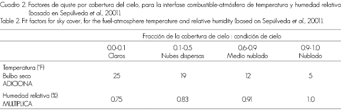 Uno de los elementos que definen la humedad relativa es la presencia de nubes. De tal manera que en un área donde están ausentes se tendrá una baja humedad relativa y ésta será mayor con la ocurrencia de ellas. Así, con base en la cobertura del cielo por nubes existe una serie de factores de ajuste en la interfase combustible-atmósfera de temperatura y humedad relativa (Cuadro 2). Dado que las quemas se realizaron en abril, mes caracterizado por una nubosidad mínima y elevadas temperaturas, se eligió la condición de cielos claros para todos los ecosistemas.