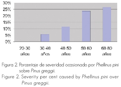 La severidad del ataque por Phellinus pini en árboles de Pinus greggii fue similar a la incidencia; esta severidad causó una pérdida de madera en pie de 12.38 % por el daño que infligió en el duramen de la madera de los anillos más internos. De igual manera, árboles menores a 30 años, no presentaron afectaciones, pero la destrucción de material estructural se incrementó con la edad, alcanzando valores de hasta 26 % en árboles de 60 a 80 años de edad (Figura 2).