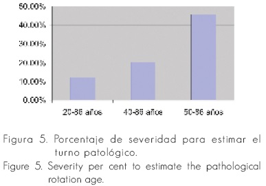 El turno patológico se define como la edad a la cual el árbol pierde lo mismo por pudrición de la madera que lo que gana por incremento anual. Para calcularlo fue necesario tomar en cuenta la severidad presentada a nivel individual, con la finalidad de conocer la proporción de árboles con daño en las diferentes categorías de edad.
