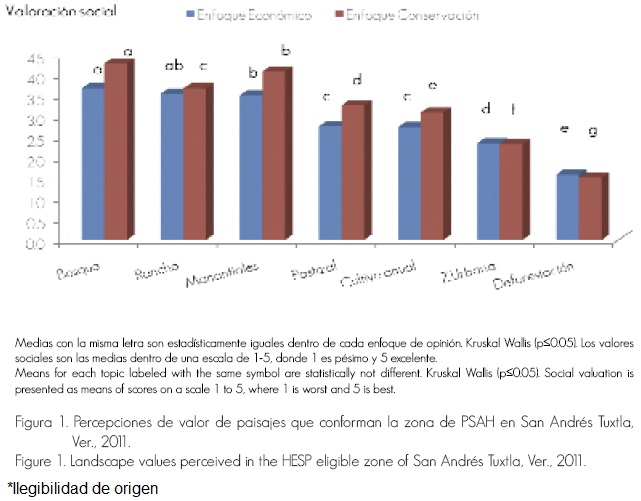 Se observó una diferencia en las configuraciones regionales de percepción de valor de los paisajes que estructuran las zonas de PSAH, donde los valores económicos superan a los de conservación en el caso de Coatepec, mientras que en San Andrés Tuxtla, aunque el bosque es percibido con un valor alto para conservación, fue similar en función de valor económico.