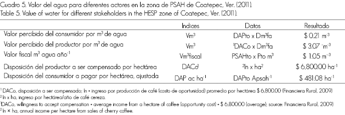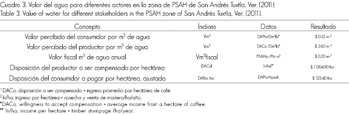 Las percepciones de valor del agua que proveen las zonas de PSAH, entre los diferentes actores del mercado son diferentes. Para el consumidor, el valor del m3 de agua fue mayor en la zona de San Andrés Tuxtla; en cambio, para los productores, el valor más alto se obtuvo en Coatepec. El valor fiscal también fue mayor en Coatepec, pues ahí se privilegian los valores fiscales.