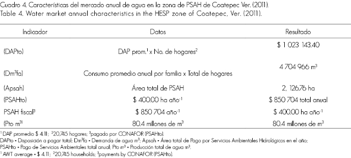La cuenca del río Gavilanes es la principal fuente de abastecimiento de agua en Coatepec. Tiene una superficie de 36.8 km2 y se ubica al NE de los municipios de Coatepec y Xico, con una captación neta de 80.4 millones de m3 (García et al ., 2005), abastece a 86,696 habitantes en 20,745 hogares, con 4.2 personas por hogar, y un consumo promedio de agua de 150L por persona (Hoekstra y Chapagain, 2008). El Cuadro 4 presenta las características generales del mercado de agua para la zona de Coatepec.