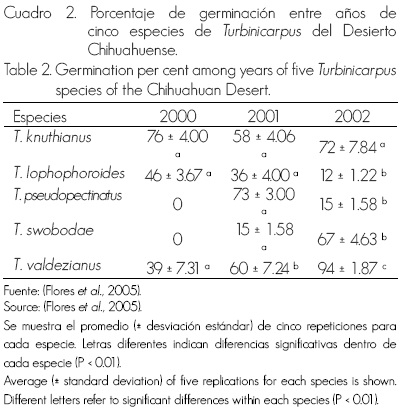Solamente T. pseudopectinatus (Backeberg) Glass et Foster, T. lophophoroides (Werdermann) Buxbaum et Backeberg y T. jauernigii Frank (Cuadro 1) presentaron latencia. Con el paso del tiempo se determinaron tres patrones de germinación (Cuadro 2): a) las semillas pierden viabilidad al año, b) las semillas permanecen viables y germinan de manera similar hasta por dos años y c) la germinación aumenta en semillas de 1 y 2 años de edad, al romperse su latencia (Flores et al., 2005). En estudios recientes con Opuntia leucotricha DC. y O. streptacantha Lem. (sin status de conservación), se determinó que la latencia se rompe con el paso del tiempo en combinación con hongos que escarifican la cubierta de las semillas (Delgado-Sánchez et al., 2010, 2011). En ambientes áridos y semiáridos no se considera que estos organismos sean relevantes (Porras-Alfaro et al. , 2008), pero a partir de los resultados anteriores debiesen tomarse en cuenta. Por lo tanto, sería importante realizar estudios sobre el tema, con otros taxa de la familia Cactaceae.