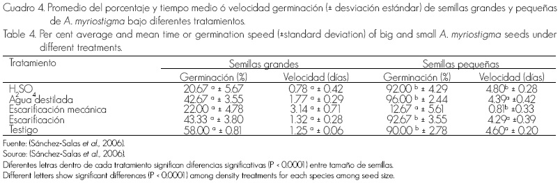 Las semillas frescas de A. myriostigma germinan bajo distintos tratamientos de manera similar o menor que sin tratamiento alguno (De La Rosa-Ibarra y García, 1994; Arredondo-Gómez y Camacho-Morfín, 1995; Rioja-Paradela y Romero-Méndez, 2002). Sin embargo, no se había evaluado la germinación de semillas "viejas". El material se sembró en cajas de Petri y se colocó en una germinadora automática Lumistell ICP-19d-c/iv con fotoperiodo de 12 h luz/ 12 h oscuridad y temperatura de 25 °C. Se utilizó una mezcla de vermiculita de grano medio (60%) y arena esterilizada (40%). Se evaluaron el porcentaje y la velocidad de germinación en semillas de dos clases de tamaño, significativamente distintas en longitud (P = 0.003) y peso seco (P < 0.0001), pero no en diámetro. Se aplicaron cinco tratamientos para romper la posible latencia tanto en semillas grandes, como en semillas pequeñas; con cinco repeticiones y 30 semillas por repetición, de tal manera que el total de semillas para cada tamaño fue de 750. Los tratamientos consistieron en: 1) inmersión en H2SO4 100%, por 5min; 2) inmersión en agua destilada por 24h; 3) escarificación mecánica, en cuyo caso se retiró con pinzas la testa del embrión, sin dañarlo; 4) enfriamiento, las semillas se mantuvieron a 5 °C por 12 h antes de la siembra y 5) un tratamiento control o testigo, en el cual las semillas se usaron sin ningún tratamiento promotor de la germinación.
