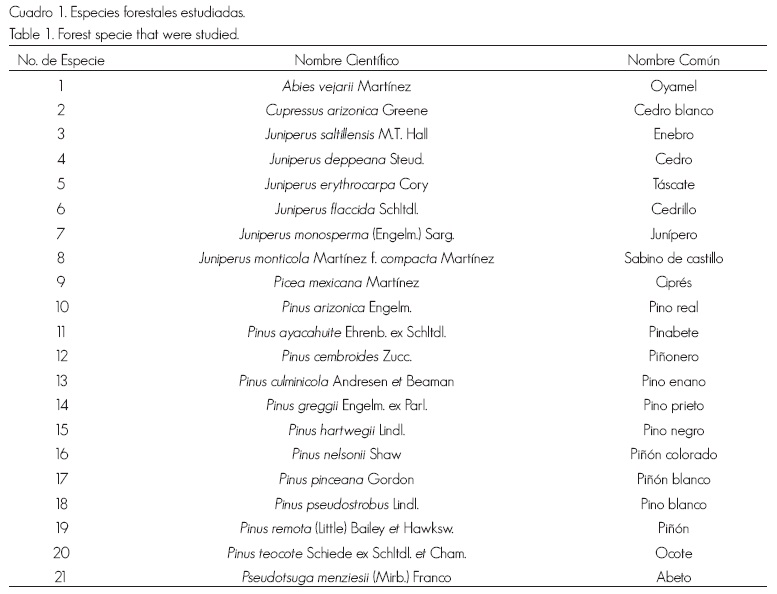La distribución regional de las coníferas en Nuevo León y Coahuila se obtuvo de una revisión bibliográfica (Martínez, 1948; Perry, 1991; Critchfield y Little, 1996; Farjon y Styles, 1997; Villarreal, 2001), a partir de la cual se seleccionaron 21 especies, por ser las de mayor abundancia (Cuadro 1); así mismo, con base en los datos reunidos se determinaron los sitios de muestreo.