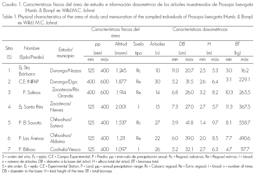 Los objetivos de la presente investigación fueron:1) generar ecuaciones alométricas para cuantificar biomasa aérea de árboles individuales de Prosopis laevigata (Humb. & Bonpl. ex Willd.) M.C. Johnst. en siete poblaciones distribuidas en el norte-centro de México; 2) evaluar la estimación de biomasa de Prosopis laevigata al ajustar el modelo alométrico en forma no-lineal y lineal; y 3) analizar los estadísticos de regresión en función del tamaño de muestra, para determinar el posible tamaño óptimo de observaciones para construir modelos alométricos en Prosopis spp.