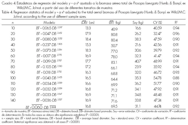 La aplicación del modelo 1 a los datos de biomasa con diferentes tamaños de muestra presentó, en todos los casos, alta significancia estadística (P < 0.0001). El mejor ajuste del modelo se obtuvo con n = 20 (R2 = 0.96 y CV = 32.47%); por el contrario, el ajuste más bajo (R2 = 0.88 y CV = 54.78%) se calculó con n = 100 (Cuadro 4). De acuerdo a los resultados, se observó un aumento de b al mismo tiempo que CV (r = 0.5914; P = 0.0259); un incremento de Sxy (r = 0.5272; P = 0.0527) y de CV (r = 0.6066; P = 0.0214) conforme aumenta n. Por último, se registró una mayor variación en la estimación de biomasa (CV) de Prosopis laevigata al aumentar el diámetro basal promedio