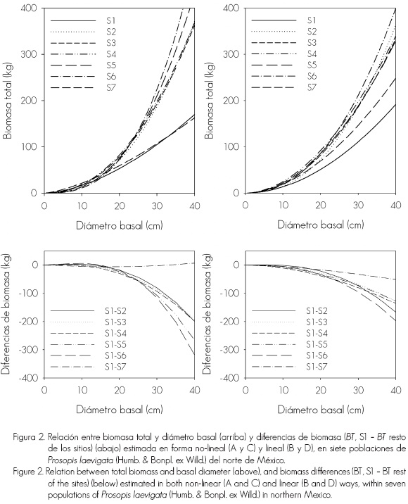 El diámetro basal de Prosopis laevigata varió de 5.2 cm (S2 y S7) a 41.8 cm (S5); es decir, comprendió distintas categorías diamétricas. Se observa que sus poblaciones, localizadas en los cuatro estados, poseen estructuras dimensionales diferentes (Cuadro 1) pero, en general, similares a los estudios realizados con Prosopis glandulosa, var. torreyana (L.D. Benson) M. C. Johnst. (diámetro de 4 a 45 cm) en el noroeste de México. En el matorral espinoso Tamaulipeco, Návar et al. (2004) registraron un diámetro basal de hasta 24 cm en árboles de Prosopis glandulosa Torr. y de 34 cm en Prosopis laevigata. Al norte de Argentina, Prosopis flexuosa DC. y P. torquata DC. sus diámetros basales alcanzan valores de 35.5 y 29.3 cm, respectivamente (Iglesias y Barchuk, 2010). Por otra parte, se apreciaron diferencias importantes en la biomasa de los árboles entre sitios de muestreo; por ejemplo, diámetros basales similares máximos (S2 y S7; S3 y S4) poseen más de 100 kg de diferencia (Cuadro 1), lo cual pudo deberse al aprovechamiento parcial o a las actividades silvícolas diferenciales practicadas en las poblaciones de Prosopis laevigata.