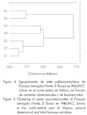 El ajuste global fue bueno, si se considera que los datos representan poblaciones de cuatro estados del norte-centro de México (Figura 1). No obstante, los individuos de los sitios evaluados muestran diferencias substanciales de biomasa aérea en las mismas categorías diamétricas, por lo que se decidió clasificar los sitios para proponer un mejor uso de los resultados. El análisis multivariado de conglomerados arrojó una correlación cofenética de 0.769, que resultó en la conformación de algunos grupos y subgrupos (Figura 4), semejantes a sitios geográficamente cercanos (Figura 1). Así, se evidencia una clara similitud entre S1 y S7, S5 y S6 (pares de curvas: parte inferior y superior Figura 2A), cuya semejanza entre curvas modelo no-lineal/dendrograma es concordante por tratarse de datos no logarítmicos en Figura 2A.