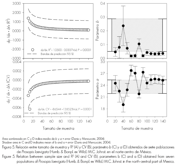 Los resultados revelan una estabilización de ambos estadísticos (R2 y CV), cuando n se aproxima a 40 (Figura 5), es decir, con n > 40 se obtienen los mejores ajustes del modelo para cuantificar biomasa aérea total de Prosopis laevigata. La varianza mínima, representada por el error de a y b (barras, figuras 5C y 5D), disminuye después de n = 40 y se mantiene constante después de este valor. Al respecto, Brown et al. (1989) documentaron estudios de biomasa de cuatro y cinco árboles; mientras que, Zianis et al. (2005) registraron que en Europa, de más de 600 modelos generados para estimar la biomasa, 30% utilizan entre 11 y 20 árboles. Al analizar esta misma relación (Figura 5) con más de 594 datos de biomasa, Návar (2010) indica que el tamaño de muestra ideal para construir modelos es de 60 árboles.