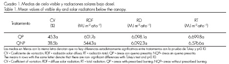 Las radiaciones solar difusa, directa y total, todas bajo dosel, son equivalentes en las parcelas con quema prescrita y en las parcelas sin quema, pues no se obtuvieron diferencias estadísticamente significativas entre ellas (p< 0.05). Lo anterior indica que al año de emplear el fuego prescrito, la poca afectación que pudo existir en el follaje de los árboles prácticamente desapareció; sólo en la porción de cielo visible se detectaron diferencias con p< 0.10 (Cuadro 1).