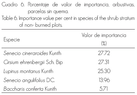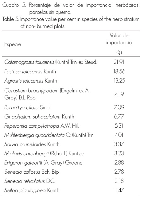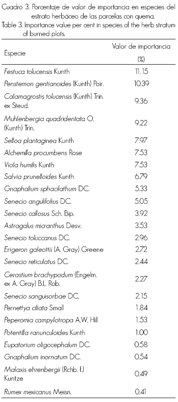 Ninguna especie domina entre las herbáceas en el área quemada con prescripción, solo existe una reducción pequeña y gradual si se ordenan en forma descendente (Cuadro 3). Festuca tolucensis y Penstemon gentianoides (Kunth) Poir. tuvieron los mayores valores; en tanto que, en el estrato arbustivo domina Lupinus montanus Kunth, con más de un tercio del porcentaje de valor de importancia (Cuadro 4).