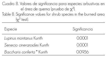 A partir de la prueba de χ2, las especies de los cuadros 7 y 8 son propias de áreas quemadas; mientras que Malaxis ehrenbergii (Rchb. f.) O. Kuntze corresponde a las áreas no siniestradas, con una significancia de 0.0896. M. ehrenbergii es considerada típica de sitios muy húmedos y sombríos del bosque de oyamel (Benítez, 1986). Las especies marcadas con asterisco en los cuadros 7 y 8 se citan por primera vez como típicas de áreas incendiadas en este ecosistema (Espinoza et al., 2008; Martínez y Rodríguez, 2008). En el caso de las arbustivas, las típicas de áreas quemadas resultaron ser Baccharis conferta, Lupinus montanus y Senecio cineraroides.
