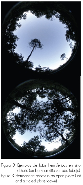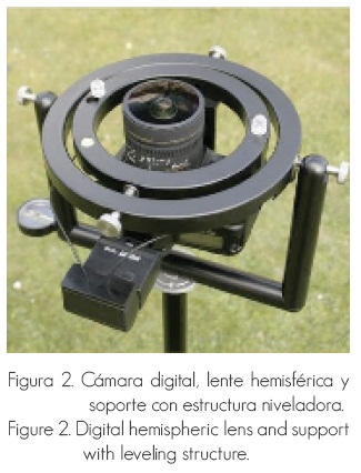 La cuantificación de la radiación solar recibida bajo dosel se realizó a través de la toma de fotos digitales desde el piso hacia el zenith, con una cámara de lente hemisférica, nivelada y orientada al norte (Figura 2).