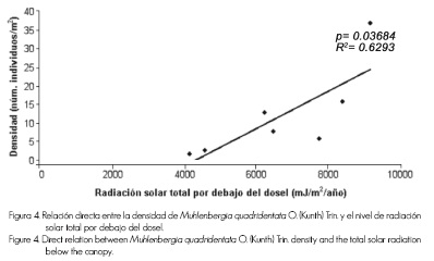 Eryngium monocephalum Cav. incrementó su densidad a menores niveles de radiación: radiación solar total debajo del dosel, p=0.01168, R2=0.9105; radiación solar directa, p=0.00975, R2=0.9205; radiación solar difusa, p=0.06764, R2=0.7238. Lo anterior posiblemente también se relacione con un requerimiento superior de humedad, la cual se mantiene mejor bajo la sombra parcial de las copas de los árboles.