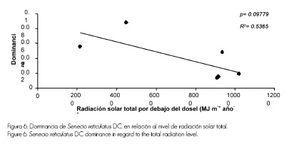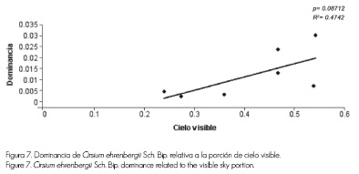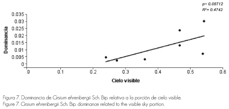 Senecio reticulatus mostró una reducción en su dominancia ante niveles más altos de radiación, que pueden relacionarse con mayores requerimientos de humedad de la especie (Figura 6). La tendencia fue parecida para la misma variable, con respecto a la radiación solar directa (p=0.09336, R2=0.546). En el caso de las arbustivas registradas en el área de la quema, dos presentaron significancia al relacionarlas con los indicadores de los diferentes niveles de radiación solar. Cirsium ehrenbergii Sch. Bip. aumentó su dominancia y densidad (p=0.07806, R2=0.5114) cuando la proporción de cielo visible aumentó (Figura 7).