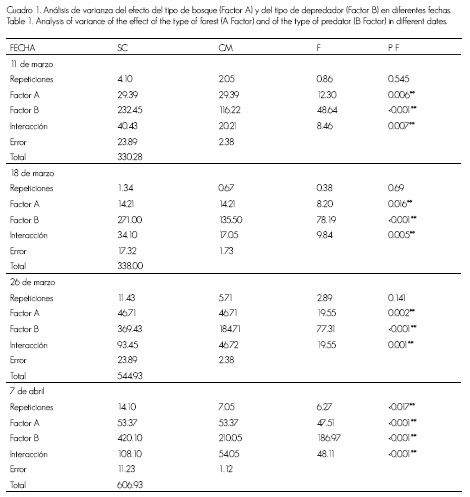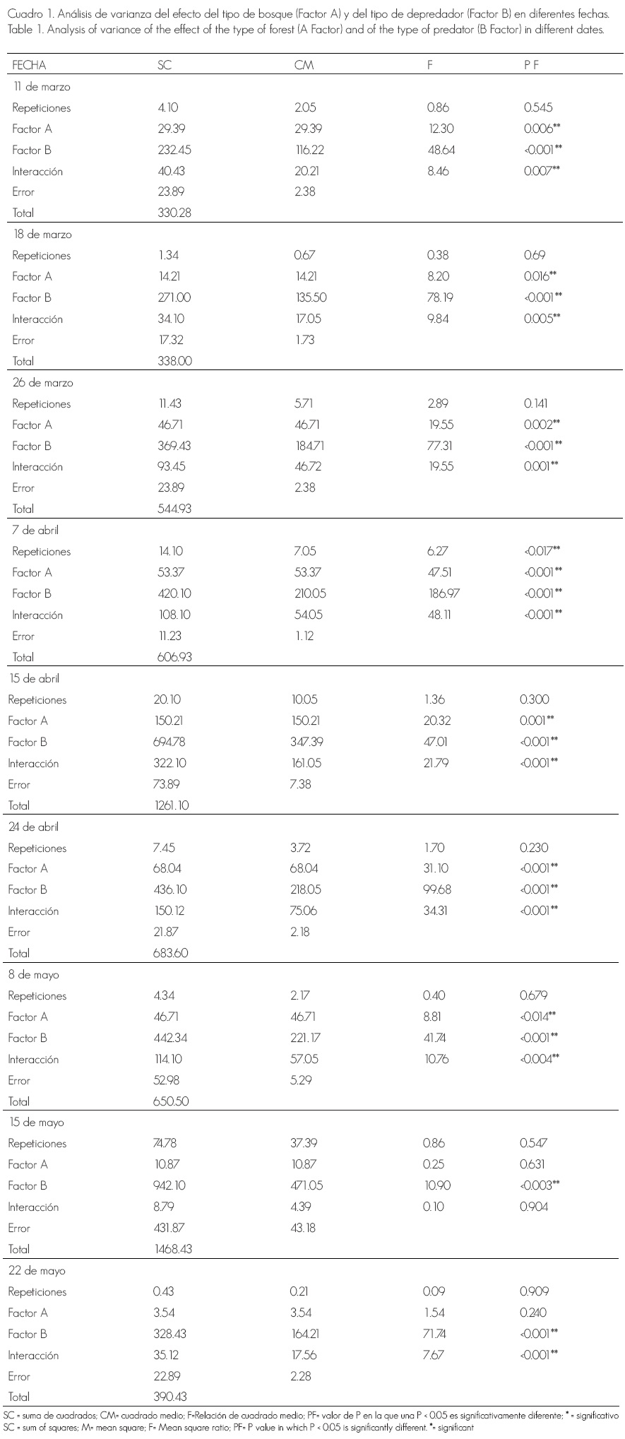 En el Cuadro 1 se muestra el resultado del análisis estadístico de los datos experimentales. Los factores evaluados interaccionaron en forma significativa en la gran mayoría de las fechas; la excepción fue el 15 de mayo, cuando el factor de depredación actuó de forma independiente. Esto quiere decir que las comparaciones entre las medias deben hacerse para un factor en cada uno de los niveles.